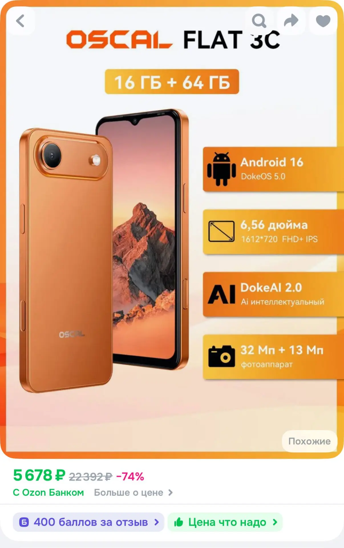 Смартфон Blackview FLAT 3C 16+64Гб за 5 678₽ + 400 баллов за отзыв — https://ozon.ru/t/JmdnGwu