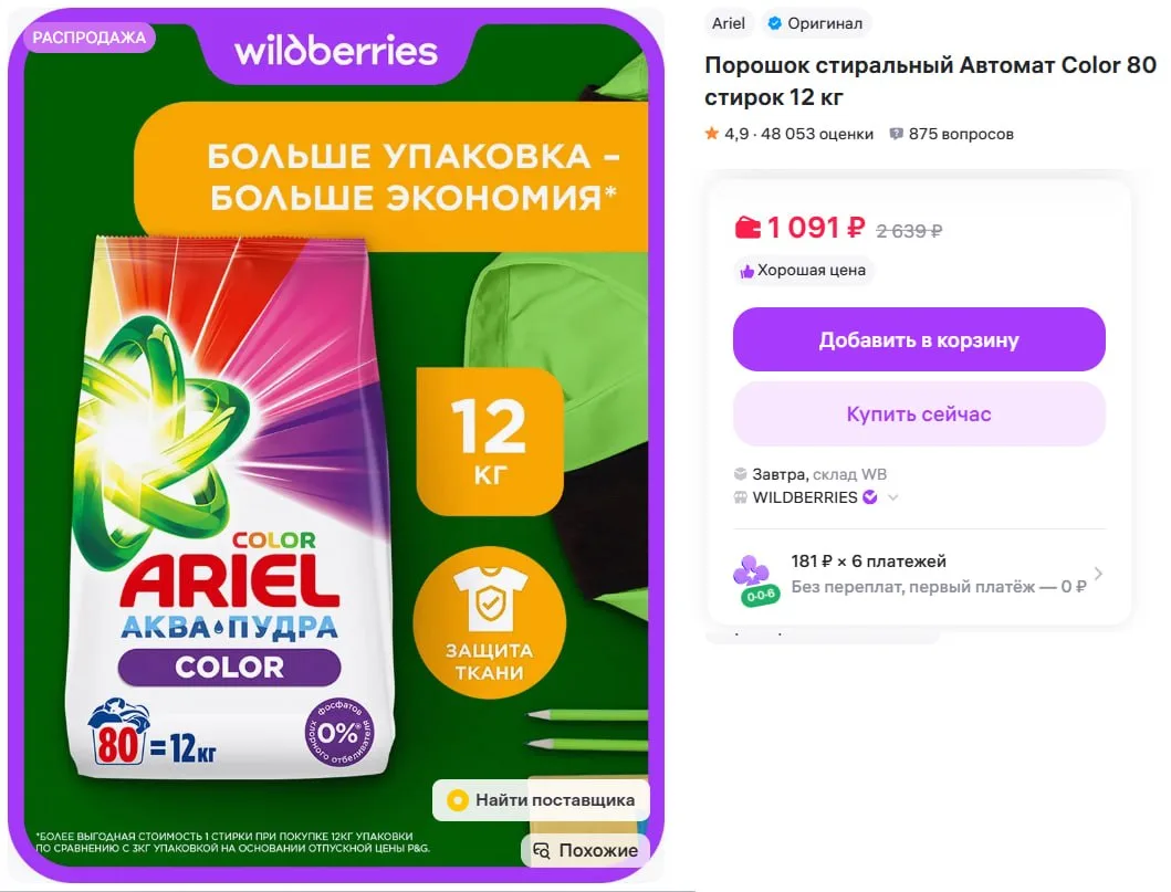 Порошок стиральный Автомат Color 80 стирок 12 кг за 1 091₽ — https://www.wildberries.ru/catalog/14239712/detail.aspx