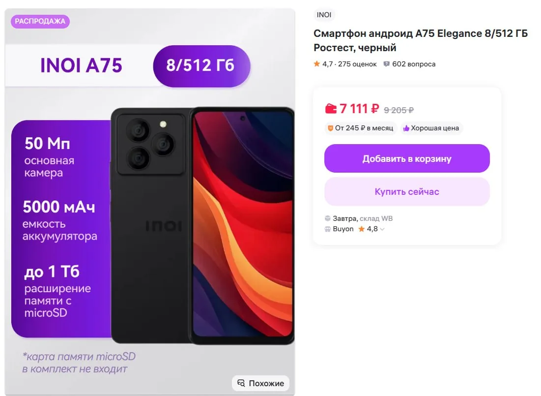 Смартфон Inoi A75 Elegance 8/512Gb, Helio G99, FHD+ 120Hz, 50Mp за 7 111₽ — https://www.wildberries.ru/catalog/318252824/detail.aspx