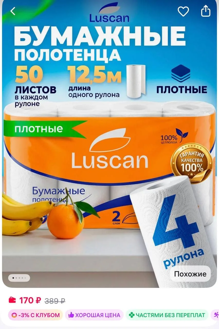 Luscan Бумажные полотенца 4 рулона за 171₽ — https://www.wildberries.ru/catalog/318258702/detail.aspx?size=479876492