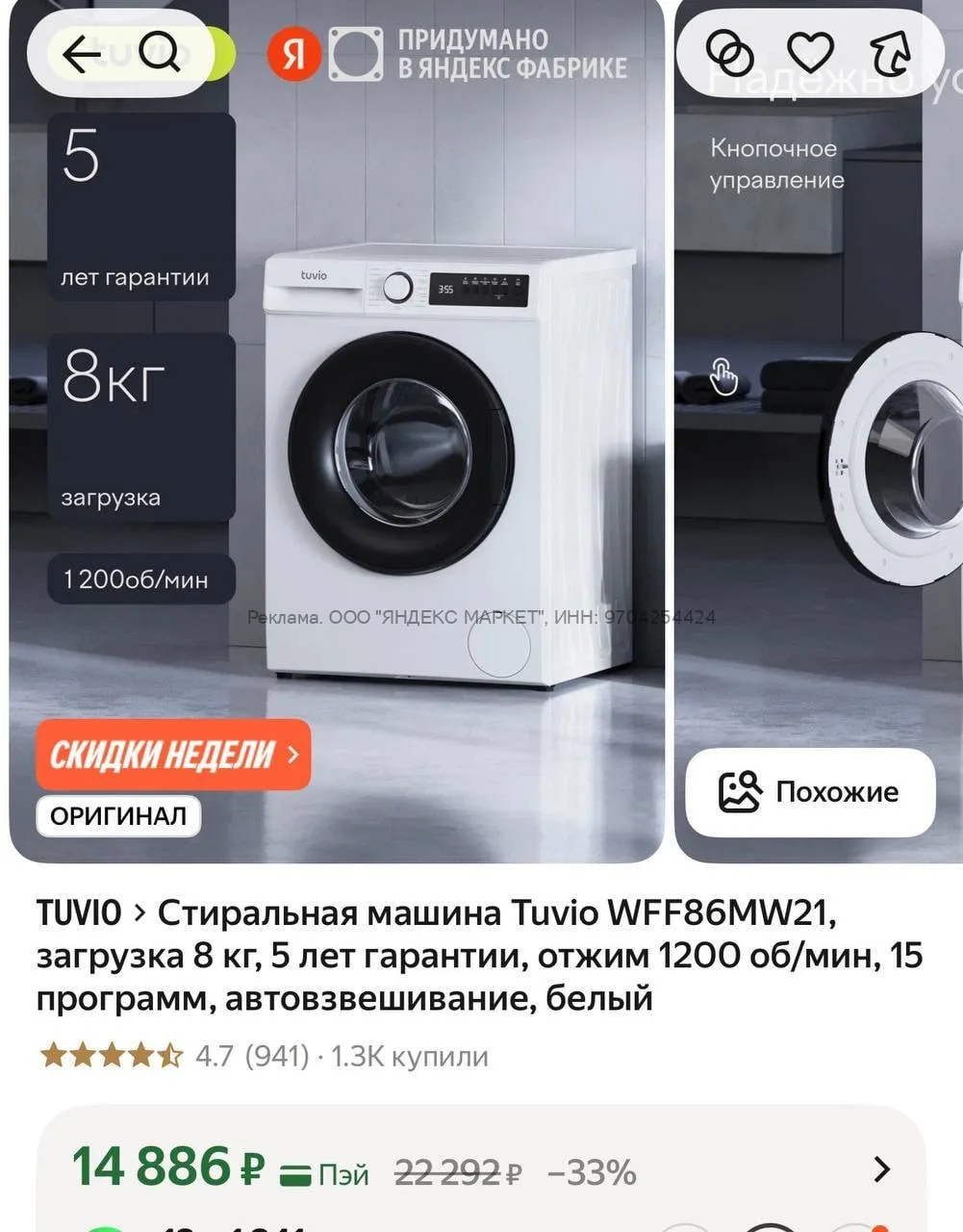 Стиральная машина Tuvio, загрузка 8 кг,автовзвешивание за 14 888₽ — https://market.yandex.ru/cc/9HoAhU?erid=5jtCeReNx12oajxVWnD2VmA