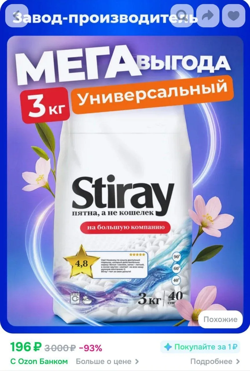 Стиральный порошок STIRAY 3 кг за 196₽ — https://ozon.ru/t/yCAAqTv