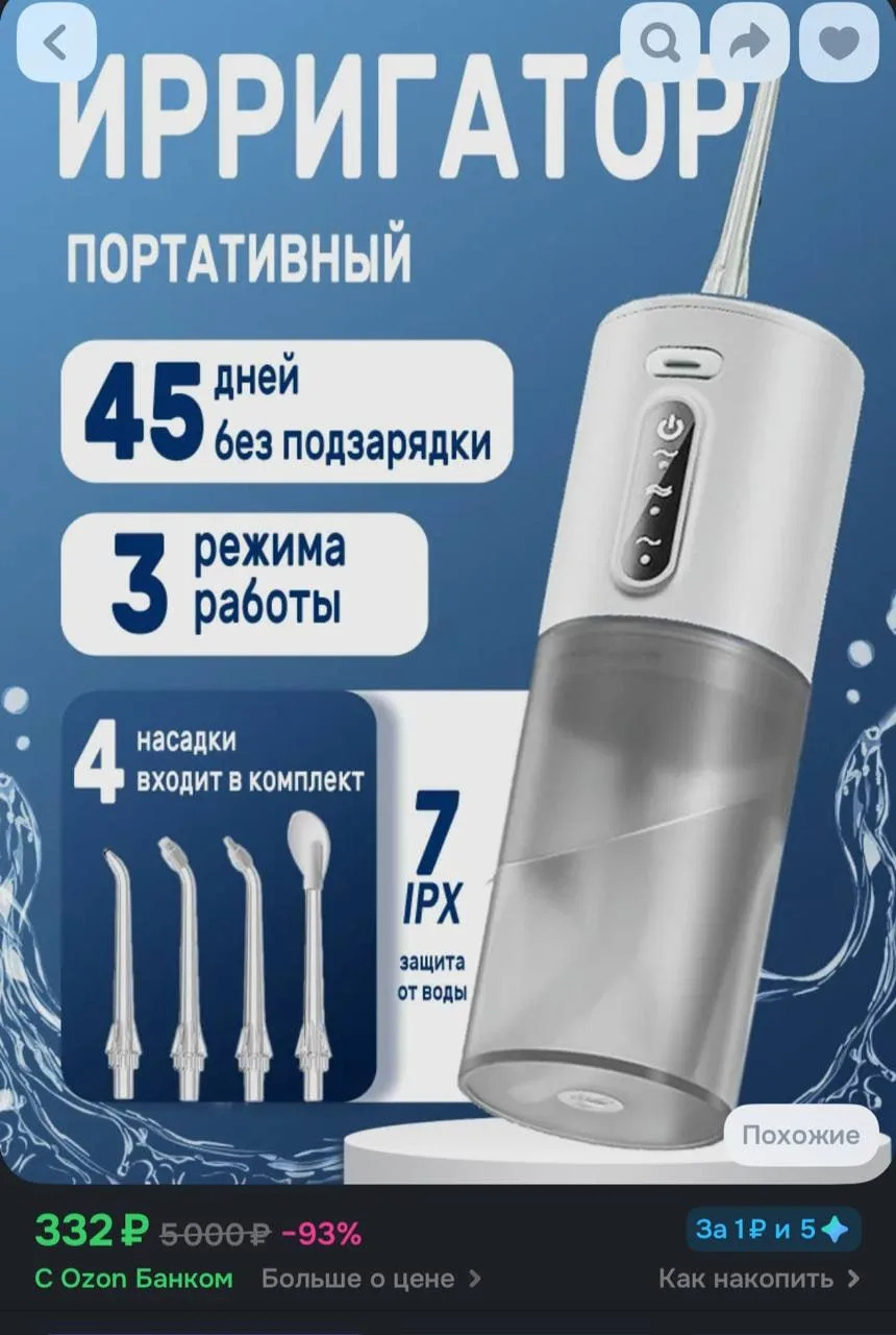 Портативный ирригатор для полости рта, 3 режима, с адаптером, белый за 332₽ — https://ozon.ru/t/NByBfEc