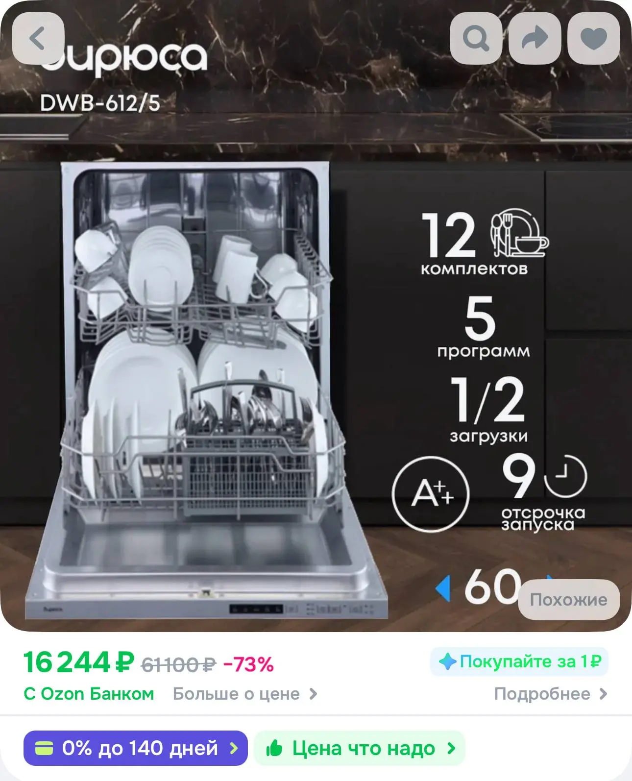 Бирюса Посудомоечная машина встраиваемая 60 см, 12 компл, 5 программ: Интенсивная Обычная ЭКО 90 Быстрая, Таймер, 1/2 загрузки, DWB-612/5 за 16 224₽ - https://ozon.ru/t/rlbE9Yv