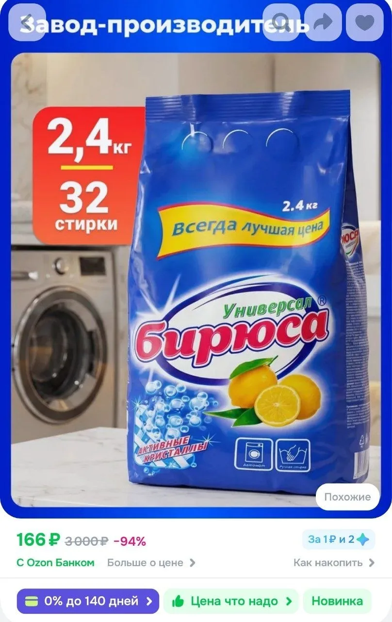 Стиральный порошок универсальный БИРЮСА 2,4кг за 166₽ — https://ozon.ru/t/AFtMdlE