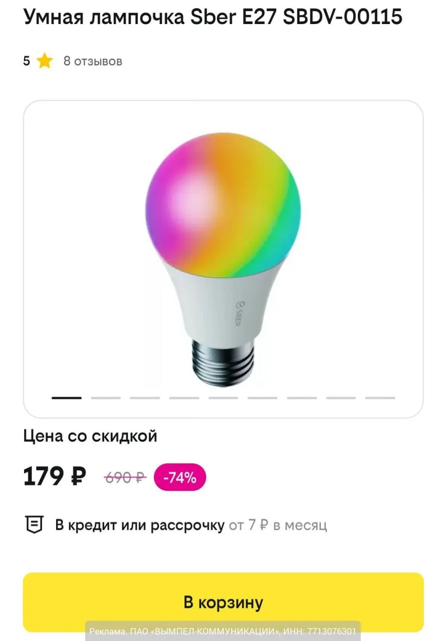 Умная лампочка Sber Е27 SBDV-00115 за 179₽ — https://2ca.ke/6CK?erid=LdtCK2Hi7