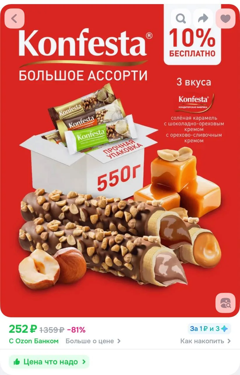 KONFESTA ОРЕХОВОЕ АССОРТИ конфет глазированных(соленая карамель, шоколадно-ореховая, орехово-сливочная), 550 грамм за 252₽ — https://ozon.ru/t/LnATCJJ