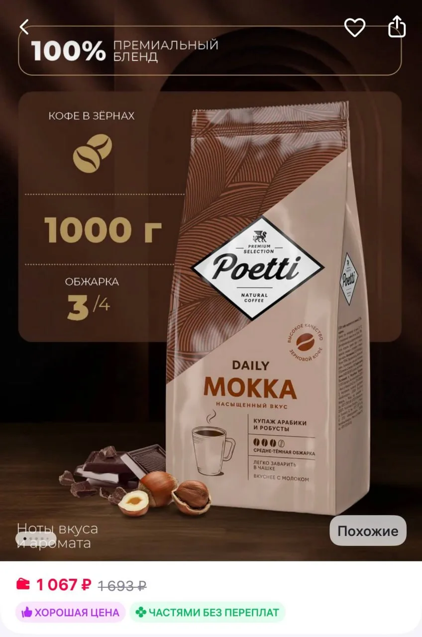Poetti Daily Mokka кофе в зернах 1 кг за 1 067₽ — https://www.wildberries.ru/catalog/119919367/detail.aspx?size=212484982