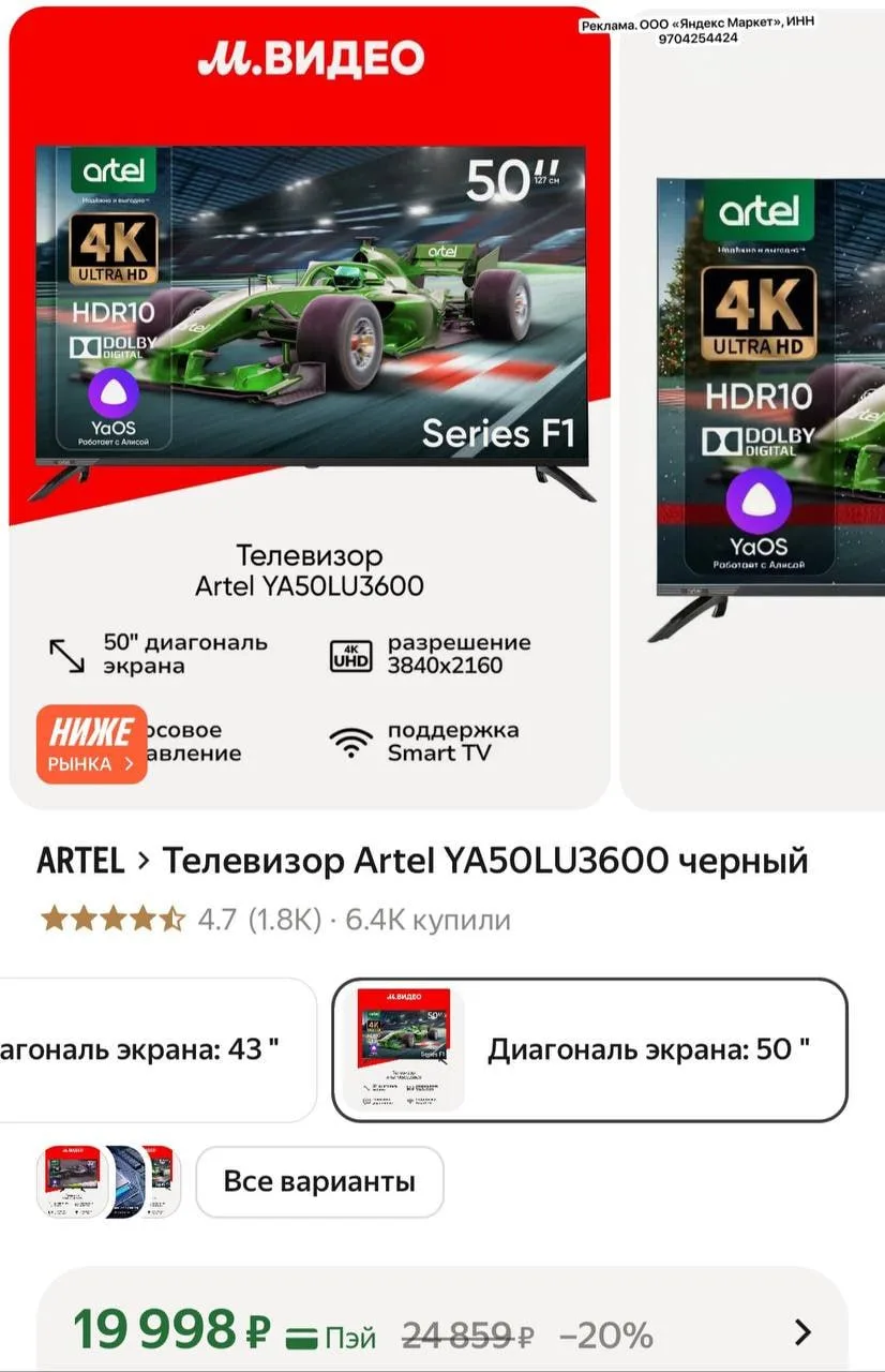 Телевизор Artel 50'' за 19 998₽ — https://market.yandex.ru/cc/9KqkPe?erid=5jtCeReNx12oajxVXEJiByA