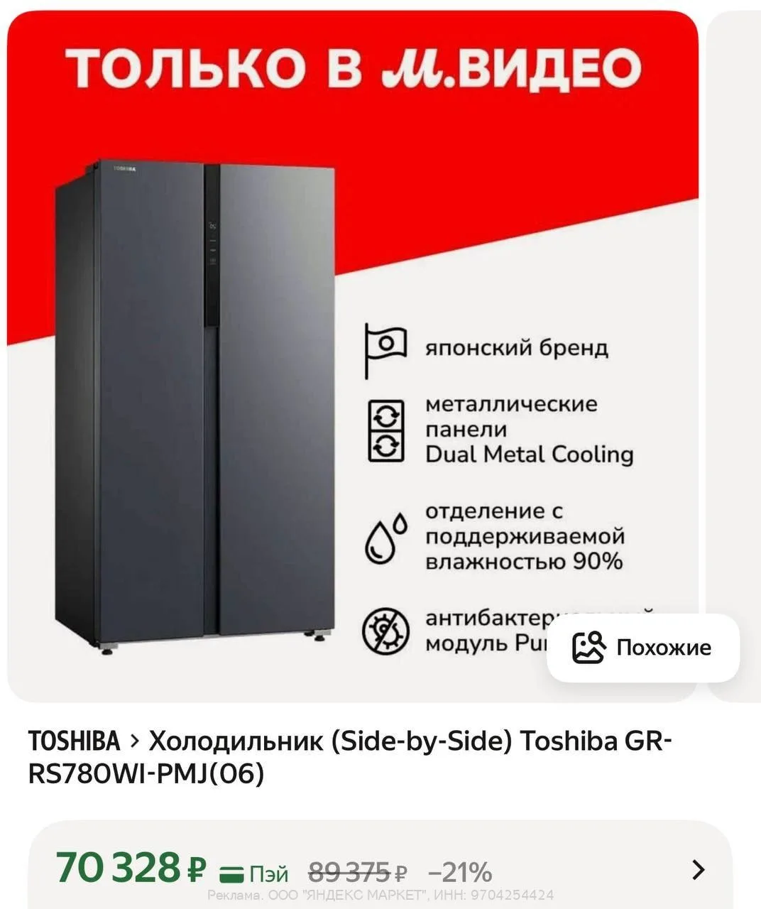Холодильник (Side-by-Side) Toshiba за 70 328₽ — https://market.yandex.ru/cc/9Kqzma?erid=5jtCeReNx12oajxVXEL9VPu