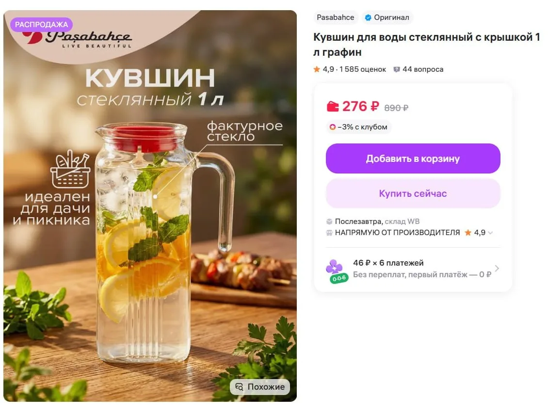 Pasabahce Кувшин для воды стеклянный с крышкой 1 л графин за 276₽ — https://www.wildberries.ru/catalog/79586084/detail.aspx