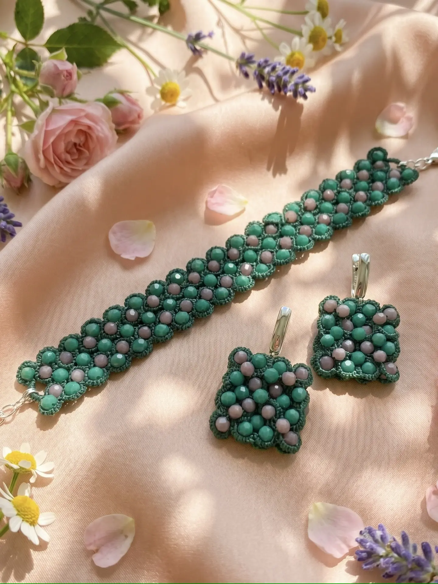 Я подгружала фото своего комплекта, который когда-то плела сама и сфотографировала просто на подоконнике и фото товара моей подписчицы из сообщества в ВК.